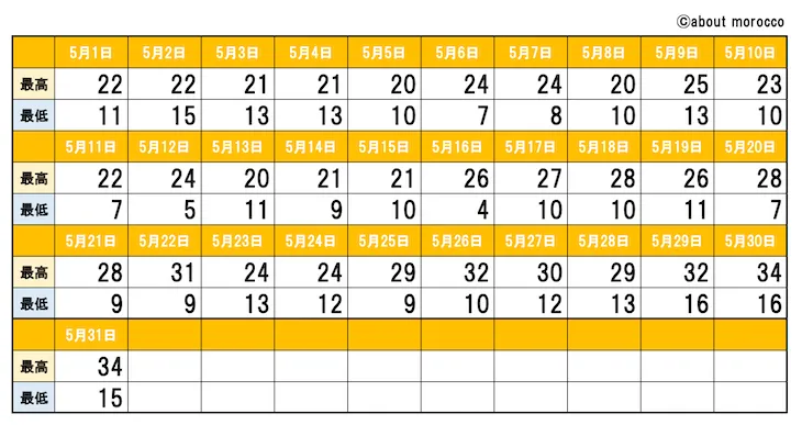 また、2019年はフェズもシェフシャウエンも5月の上旬時点で30℃前後になる日が続出しました。