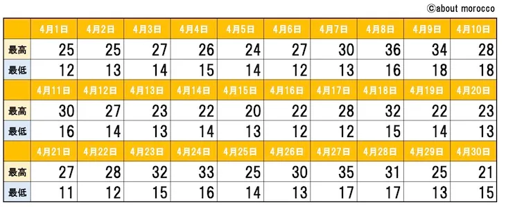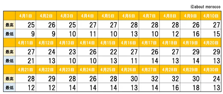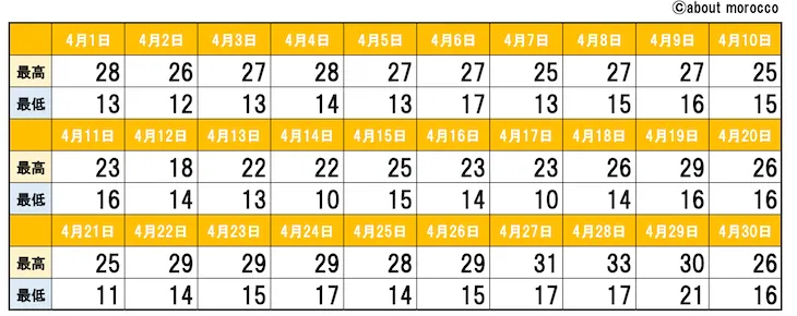 4月になると昼間は暑くて半袖で良かったりするものの、夕方以降になると急に寒くなり、寒暖差の激しい時期です。また、アトラス山脈付近ではまだ雪が降ったり、積もっていることも。