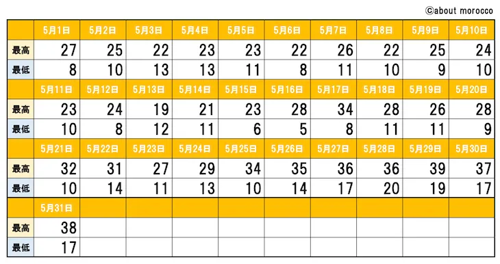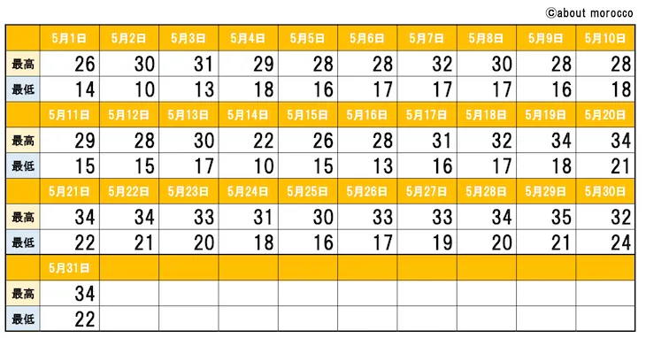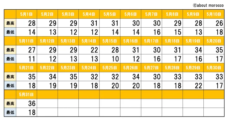 最高気温が25度を超える日が多くなり、砂漠のあるメルズーガやワルザザードでは30度を超える日も出てきます。